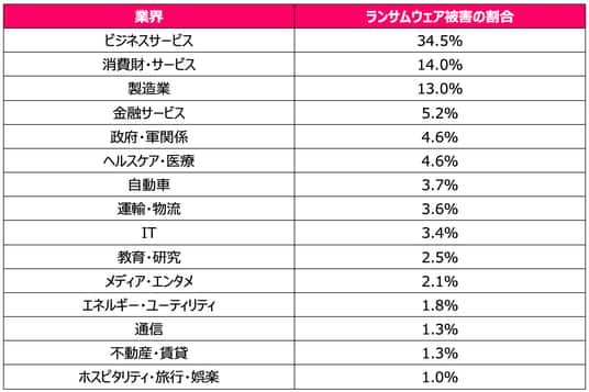 業界別では、「ビジネスサービス」分野が最も多く標的とされ、ランサムウェア被害全体の34.5%を占めました。これに「消費財・サービス」(14%)と「製造業」(13%)が続き、これら上位3業界だけで報告された被害の61.5%を占めています。