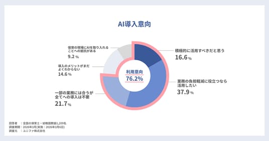 保育AI(TM)を中心としたテクノロジーの力で保育や子育てに関する社会課題を解決するユニファ株式会社(本社:東京都千代田区、代表取締役CEO:土岐泰之、以下「ユニファ」)は、全国の保育士・幼稚園教諭など1,209名を対象にした「保育士・幼稚園教諭のAI活用に関する実態調査 2026」(以下、「今回調査」)を2026年3月実施しました。