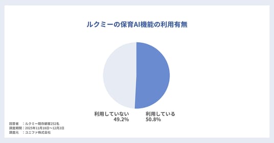 - ルクミーの保育AI機能の利用率は約半数(50.8%)に到達 今回調査において「保育専門ICTのAI機能」の利用率がわずか11.1%にとどまる中、前回調査のアンケート回答者(ルクミー導入園)では(50.8%)がルクミーの保育AI機能を利用しており、現場への浸透度合いに大きな差があることが分かりました。