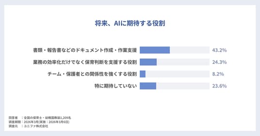 - 一部業務への導入も含めAI導入意向は全体の7割以上(76.2%)。将来、AIに期待する役割は「書類・作業支援(43.2%)」に次いで、「保育の意思決定をサポートする役割(24.3%)」 が上位に