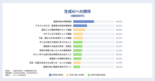 - テキスト生成の“次のAI”活用として、「写真管理AI」や「意思決定サポートAI」 への需要が拡大。写真の枚数カウント・偏り検出(25.6%)、ボケ・ブレ写真の自動検出(20.3%)など、保育特有の課題解決への期待が鮮明に