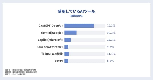 - 生成AIツールは、7割以上(72.3%)がChatGPTなどの汎用AIを利用。保育業務に特化したAI機能の認知度は低い