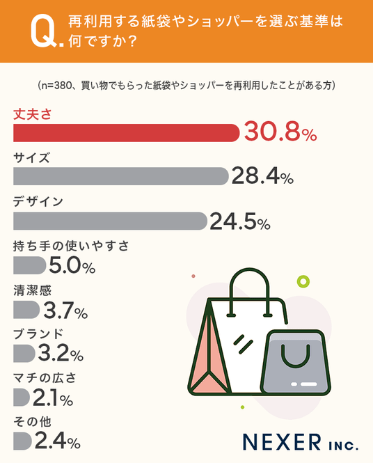 ■再利用する紙袋を選ぶ基準、1位は「丈夫さ」で30.8%