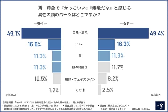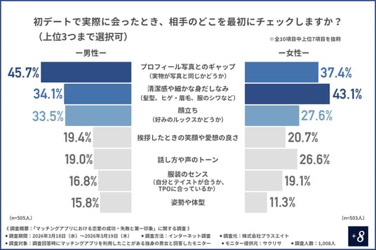 第一印象で「かっこいい」「素敵だな」と感じる異性の顔のパーツは男女ともに「目元」と「口元」が上位になり、さらに、初デートでは「プロフィール写真とのギャップ」や「清潔感や細かな身だしなみ」を最初にチェックする方が多いことがわかりました。