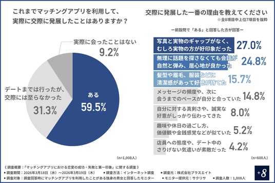 株式会社プラスエイト(所在地:東京都新宿区、代表取締役社長:佐々木 啓介)は、マッチングアプリを利用したことがある独身の男女を対象に、「マッチングアプリにおける恋愛の成功・失敗と第一印象」に関する調査を実施しました。