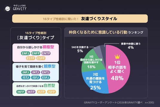 本調査は、SNS「GRAVITY」のユーザー200名を対象に実施しました。男女比は女性約71%・男性約21%・その他約8%で10代~30代の若年層を中心に幅広い年齢層から回答を得ています。16タイプ性格診断別に分析することで、新学期など新しい環境での友達づくりの傾向や人間関係の築き方の違いが明らかになりました。