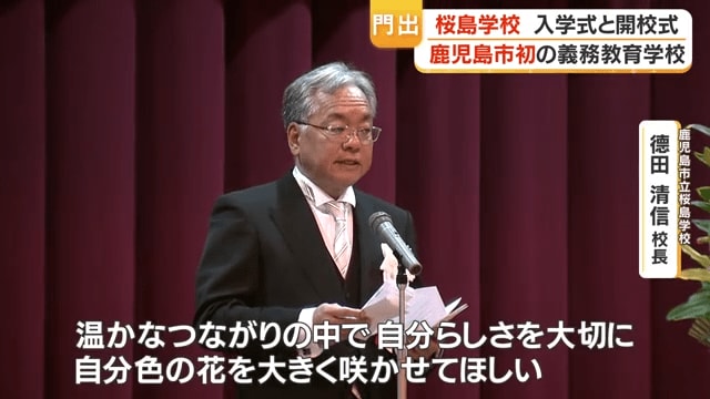 入学式に続いて開かれた開校式では、鹿児島市教育委員会の原之園哲哉教育長が「伝統と地域の皆さんの思いを引き継ぎ、未来をつなぐ新たな学校として鹿児島市立桜島学校の開校を宣言する」と高らかに宣言し、鹿児島市初の義務教育学校の歴史的な第一歩を刻んだ。