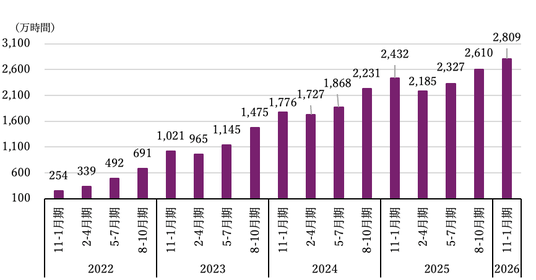 ・2026年1Q(2025年11月-2026年1月期)の延べ総労働時間(稼働実績)は2,809万時間(前年同期比+15.5%)