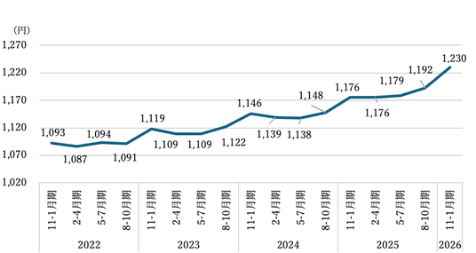 ・2026年1Q(2025年11月-2026年1月期)の三大都市圏のスポットワーク平均時給は1,230円(前年同期比+4.6%)