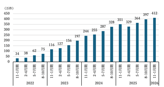 ・2026年1Q(2025年11月-2026年1月期)の全国のスポットワーク募集件数は412.1万件(前年同期比+17.4%)
