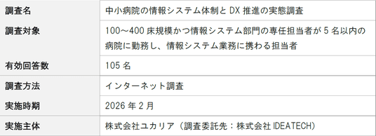 本調査は、中小病院の情報システム部門が置かれている現状を数値で示すことで、医療機関の経営層や行政機関が現場の実情を把握し、具体的な対策を講じるための基礎資料となることを目的としています。
