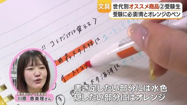 取材に訪れた鹿児島市の学習塾「受験ラサール加治屋」で、この春中学3年生になった生徒たちに話を聞くと、暗記用の2色ペンが欠かせないとの声が相次いだ。「青とオレンジ。必需品。暗記系の社会と英語、数学の公式を覚えたいときにも使う」という。