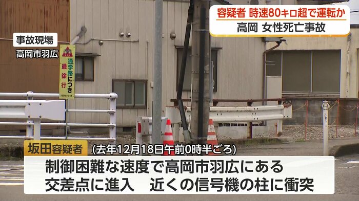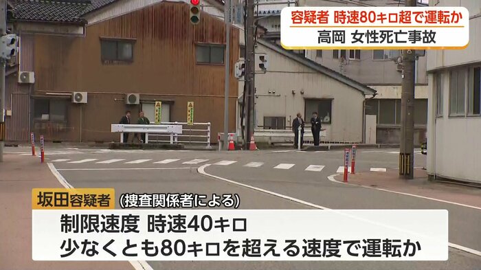 去年12月、富山県高岡市で女性が死亡した事故で、危険運転致死などの疑いで逮捕・送検された男が制限速度の2倍となる時速80キロを超えるスピードで運転していたとみられることがわかりました。