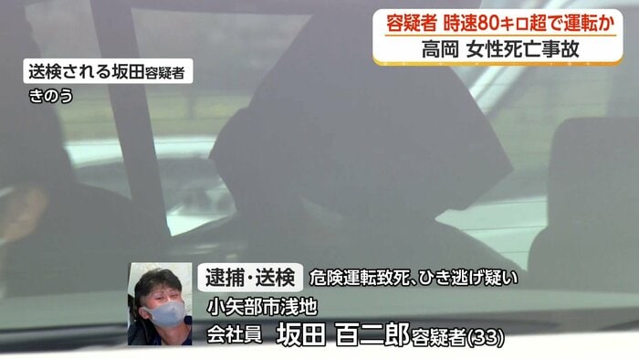 危険運転致死とひき逃げの疑いで逮捕・送検された小矢部市の会社員、坂田百二郎容疑者(33)は、去年12月18日の午前0時半頃、制御困難なスピードで高岡市羽広の交差点に進入し、信号機の柱に衝突。同乗していた朝日町の会社員、高橋幸菜さん(33)の救護を行わず、立ち去り、死亡させた疑いです。