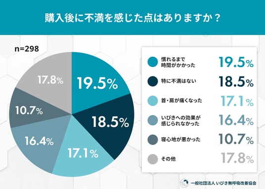 - 不満の要因は効果の有無だけでなく、「慣れるまでの時間(19.5%)」や「首・肩の痛み(17.1%)」など身体的違和感が上位