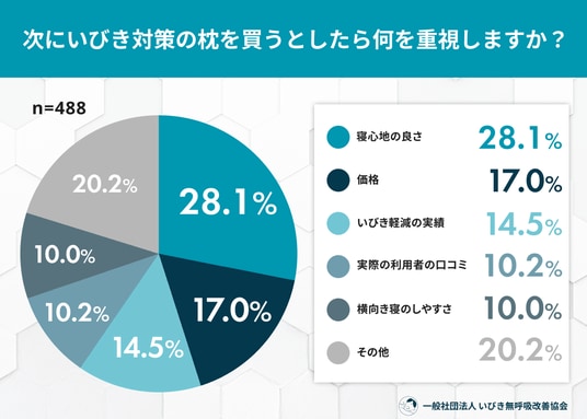 → いびき対策枕を購入する動機として最も多かったのは、周囲からの指摘でした。自分自身の健康維持(睡眠の質向上)よりも、まずは「他者への迷惑を解消したい」という切実な思いが購入を後押ししている現状が伺えます。