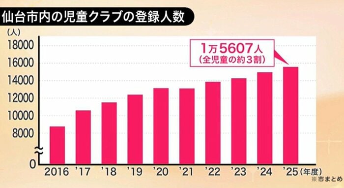 仙台市は現在、市内113カ所に児童クラブを設置しており、月額3000円という手頃な利用料で、放課後や長期休暇中の居場所を提供している。昨年度の登録児童数は1万5607人と、全児童の3割に達し、利用希望者は右肩上がりで推移している。