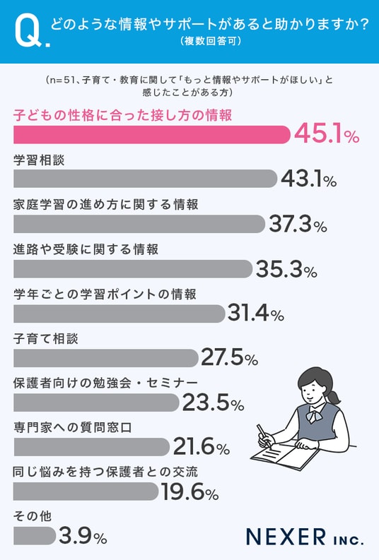 最も多かったのは「子どもの性格に合った接し方の情報」で45.1%でした。
