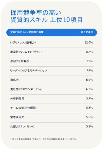 AIツールの台頭によりスキル需要が変化するなか、人間固有の思考や行動特性である「15の主要な資質的スキル」について需要動向を分析した結果、「リーダーシップとモチベーション」が昨年7位から首位へ急浮上しました。その需要スコアは第2位の「問題解決」の約2倍に達しています。特筆すべきは、これらの資質的スキルを持つ人材の獲得難易度です。「レジリエンス(逆境力)」を求める職種の欠員率は12.0%と、AI・オートメーションスキルの7.8%を大きく上回り、テクニカルスキル以上に採用が困難な現状が浮き彫りとなりました。一方、自身のコミュニケーション能力を強みとする候補者は33%も減少しており、職務経歴書では見えにくい「潜在的な資質」をいかに可視化し、確保できるかが、今後の企業成長の鍵となります。