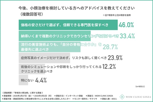 「今後、小顔治療を検討している方へのアドバイス」について尋ねたところ、『価格の安さだけで選ばず、信頼できる専門医を探すべき(46.0%)』と回答した方が最も多く、『納得いくまで複数のクリニックでカウンセリングを受けるべき(33.4%)』『流行の美容施術よりも、「自分の骨格に合うか」を最優先に選ぶべき(28.7%)』と続きました。