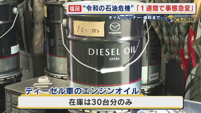 「ディーゼル車のエンジンオイルが、かなりいま危機的状況になっていて、もうこれだけなんですよ。うちにあるのが。これからも入ってこない状態なので…」と仕事場の片隅に置かれたエンジンオイルを指差す。現在30台分しか在庫がないというのだ。