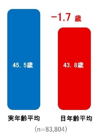 ・ 万博会場で測定する「目年齢」、平均は43.8歳となり、実年齢の平均(45.5歳)を下回る結果となりました。