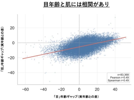 「目」年齢と「肌」年齢のギャップには正の相関関係が見いだせました。