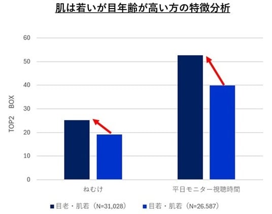 ・ 肌スコアは若いのに「目」年齢が実年齢より高い方が4割もいて、この層を比較分析すると、日中の眠気を感じている人が多く(TOP2差分:6.0pt)、またモニターの視聴時間が長い(TOP2差分:12.3pt)ことが確認されました。肌が若くても油断大敵。『目』で損をしているかもしれません。モニター視聴時間がもたらしうる『目年齢』の格差が示唆されました。