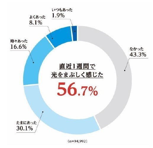 「普段の生活でまぶたの重さや目の乾きはあるか」という質問に対し、62.1%の人が「感じる」(「感じる」「少し感じる」「非常に感じる」の合計)と回答しました。また、「この1週間で目が乾くことがあったか」という問いにも59.6%の人が「あった」と答えており、多くの人が目の不快感を抱えながら日常を過ごしていることがうかがえます。