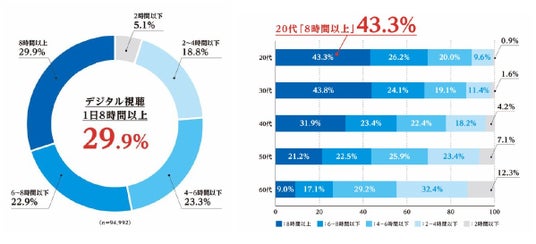 約3割が「8時間以上」と回答しました。特に、20~30代では4割以上が該当し、若い世代ほど長時間デジタルデバイスに触れている実態が浮き彫りになりました。