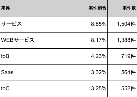2026年4月時点のGo言語案件は、サービスが8.85%(1,504件)で1位、WEBサービスが8.17%(1,388件)で2位、toBが4.23%(719件)で3位、SaaSが3.32%(564件)で4位、toCが3.25%(552件)で5位となり、上位5業界で全体の約27.8%を占めます。