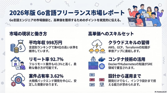 市場価値が高い背景には、高い並行処理性能を活かしたAPI開発やマイクロサービス構築に加え、KubernetesやDockerとの親和性からSRE領域やインフラ設計まで横断的に対応できるスキルの汎用性があります。また、クラウドネイティブ環境の普及も単価を押し上げる要因となっています。