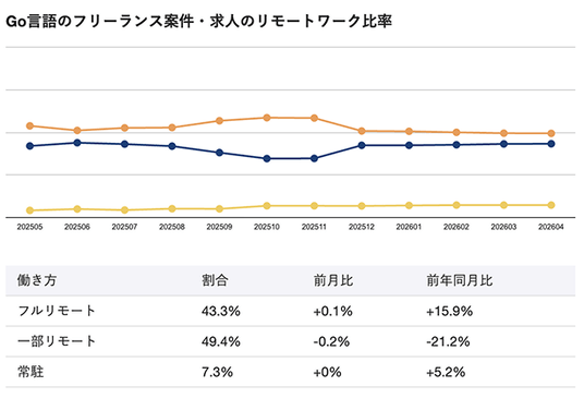 2026年4月時点のGo言語向けフリーランス案件・求人におけるリモートワーク比率は、フルリモートが43.3%、一部リモートが49.4%、常駐が7.3%となっています。