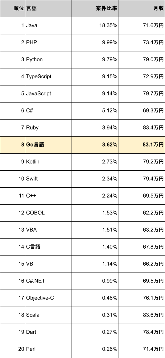 Go言語の案件数ランキングは8位(案件比率 3.62%)