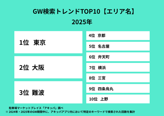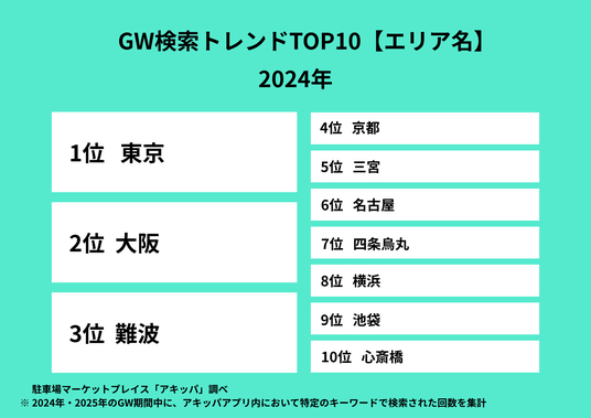 駐車場マーケットプレイス「アキッパ(akippa)」を運営するakippa株式会社(代表取締役社長 CEO:金谷元気)は、2024年・2025年のゴールデンウィーク(GW)期間におけるサービス内の検索動向(※)および、2026年GWのおでかけに関する意識調査の結果を公開します。