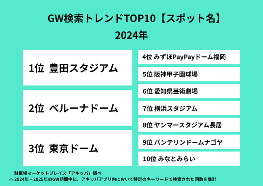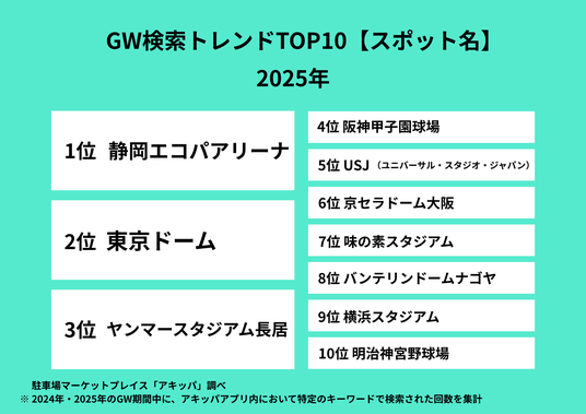 2025年の検索データを見てみると、2024年の検索データでは前年圏外だった「静岡エコパアリーナ」が第1位という結果になりました。同施設ではGW期間中にアーティストの全国ツアー公演などの大型イベントが開催されていました。エコパアリーナは最寄り駅から距離があるため、車での来場を希望する人が多かったことが伺えます。