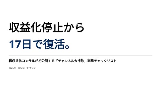 株式会社日本動画センター(本社:福岡県福岡市、代表取締役:山口直也)は、2026年基準のYouTube収益化審査に対応した「チャンネル大掃除」の実務手順をまとめた資料『収益化停止から17日で復活。再収益化コンサルが初公開する「チャンネル大掃除」実務チェックリスト』を無料公開しました。