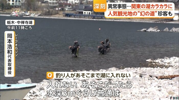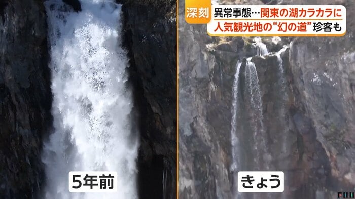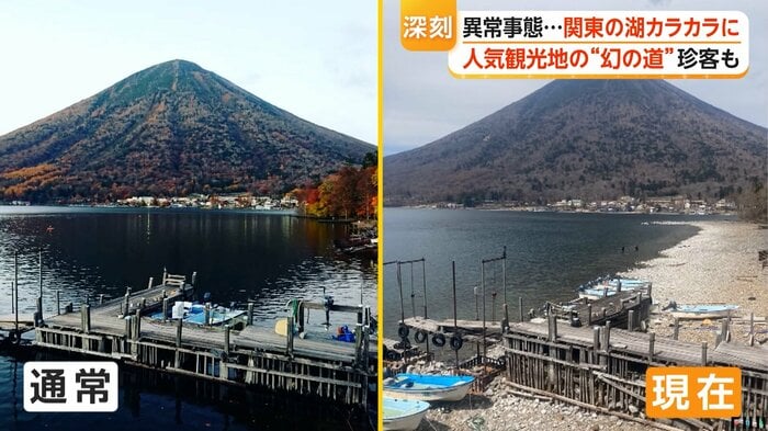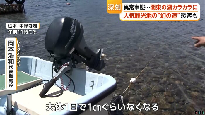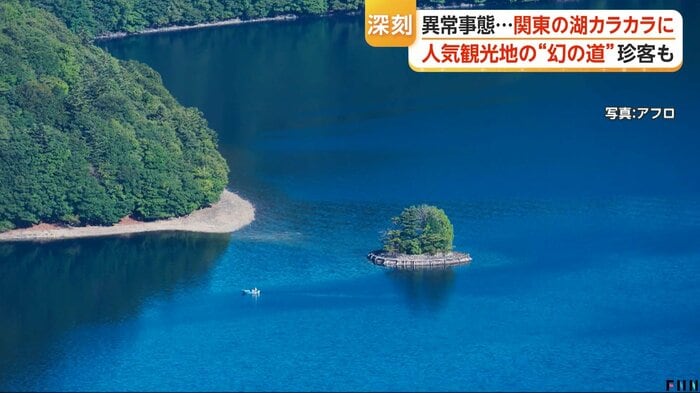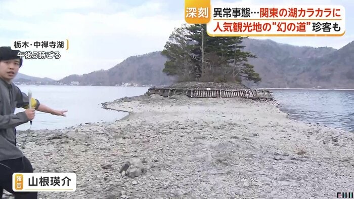 雨不足により人気観光地に異常事態。中禅寺湖では湖底が露出して島まで歩いて行ける幻の道が出現した。華厳の滝は夜間の放水を完全停止。山梨・河口湖では水不足で田植えに影響が出ている。