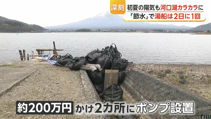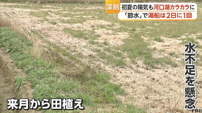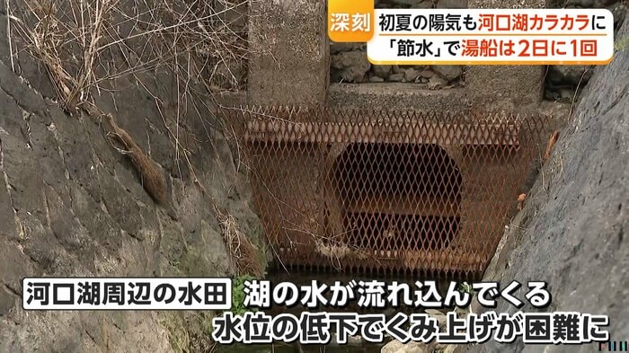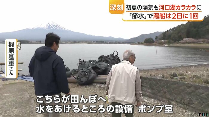 河口湖周辺の水田では湖の水が流れ込んでくるが、湖の水位の低下によって、くみ上げが困難な状況になっているという。