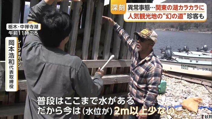 マス釣りの聖地として知られる中禅寺湖では、貸しボート店にとって水位の低下は大打撃となっていた。