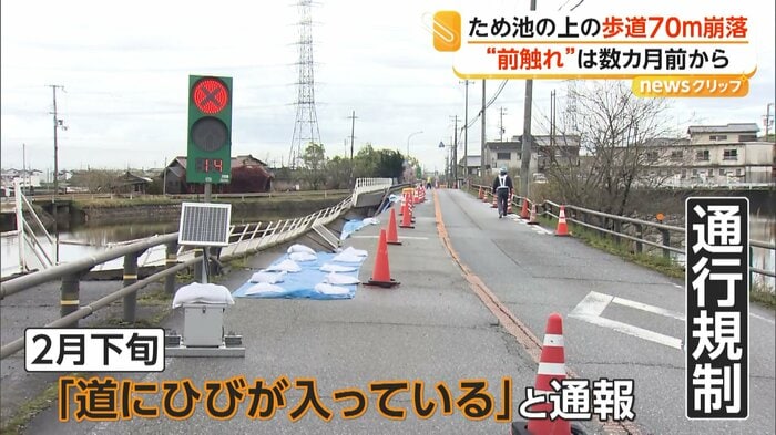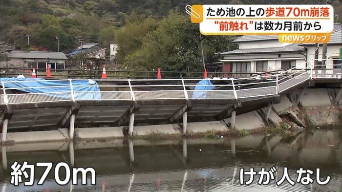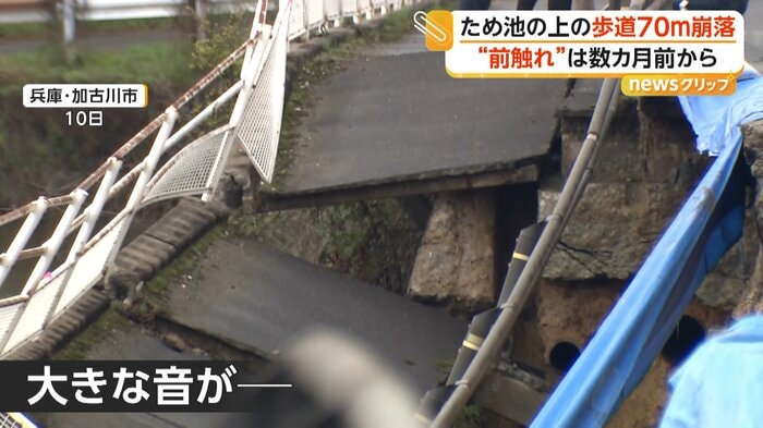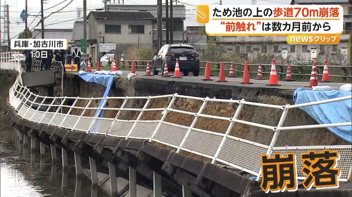 兵庫・加古川市のため池上の歩道が10日、約70mにわたって柵ごと崩落した。2月下旬からひび割れの通報を受け通行規制をしていたという。