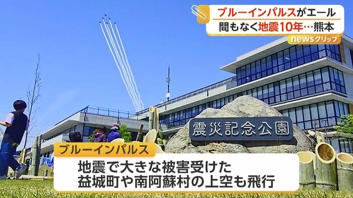 熊本地震から10年を前に、航空自衛隊のアクロバット飛行チーム「ブルーインパルス」が今も復興への歩みを進める被災者にエールを込めて、熊本の空を駆け巡った。