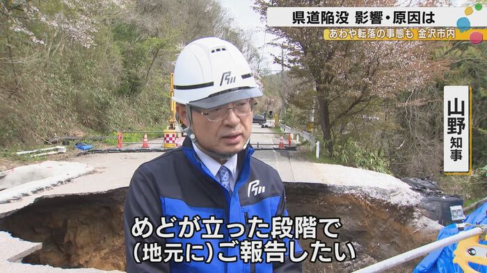 山野知事は復旧に向けてこのように述べた。「できるだけ早くに安全を確保した上で、通ることができればと思ってます。いつまでにということは今の段階で申し上げることはできませんが、工事の進捗状況を確認しながら、目処が立った段階でご報告したいというふうに思っています。」