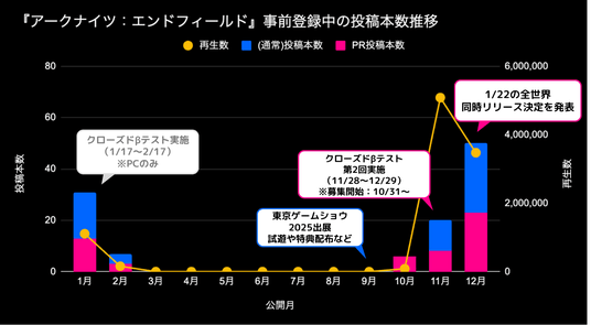 LIVEOPSIS|『アークナイツ:エンドフィールド』事前登録中の投稿動画本数推移(2025年1~12月)