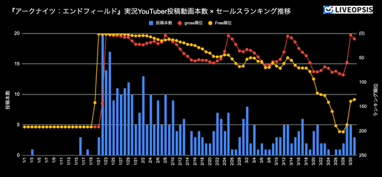 LIVEOPSIS|『アークナイツ:エンドフィールド』投稿動画本数・再生数推移(1~3月)