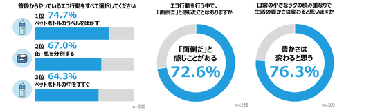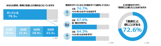 一方で、エコ行動を行う中で「面倒だ」と感じたことがある人は7割以上となり、環境意識の高さと実践時の負担感にギャップがあることが明らかになりました。