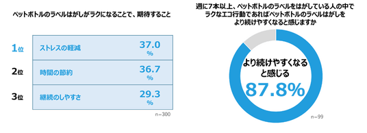 ペットボトルのラベルはがしがラクになることで期待することとして、「ストレスの軽減(37.0%)」、「時間の節約(36.7%)」、「継続のしやすさ(29.3%)」が上位となりました。週に7本以上のペットボトルのラベルをはがしている人の中で「ラクなエコ行動であればペットボトルのラベルはがしをより続けやすくなる」と感じる人は約9割で、「エコ行動」の継続において「ラク」が重要な要素であることが判明しました。