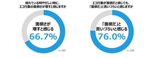疲れている時や忙しい時に「エコ行動」の面倒さが増すかを聞いたところ7割弱の人が「面倒さが増すと感じる」と回答しました。こうした「エコ行動」が面倒だと感じても「面倒だ」と言いづらいと感じる人が76.0%に上ることが分かり、「良いことに対して文句を言いにくい」という心理が浮き彫りになりました。