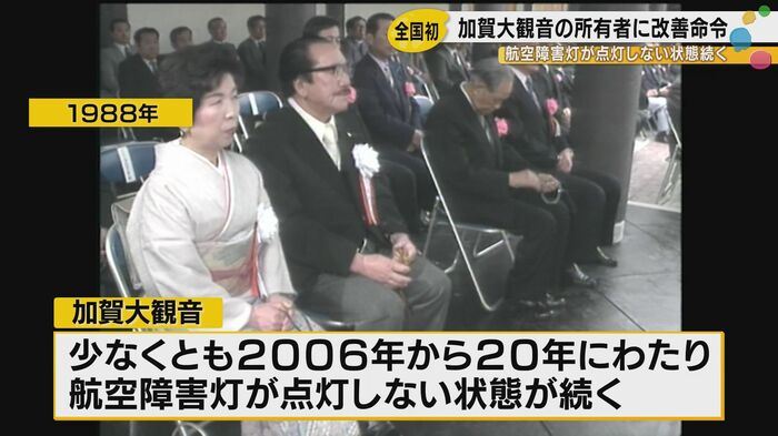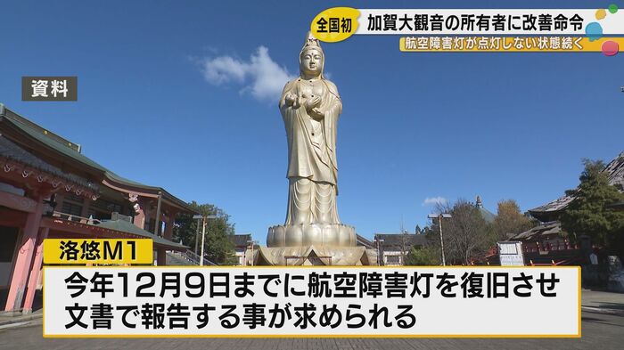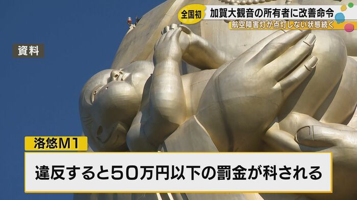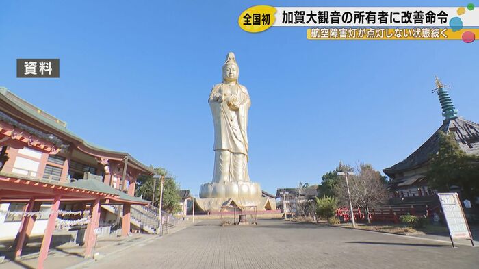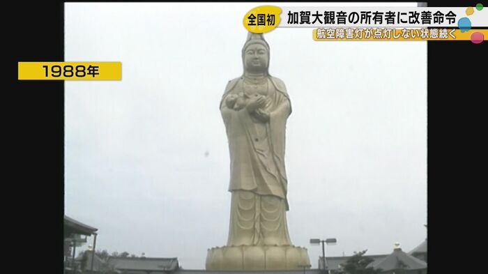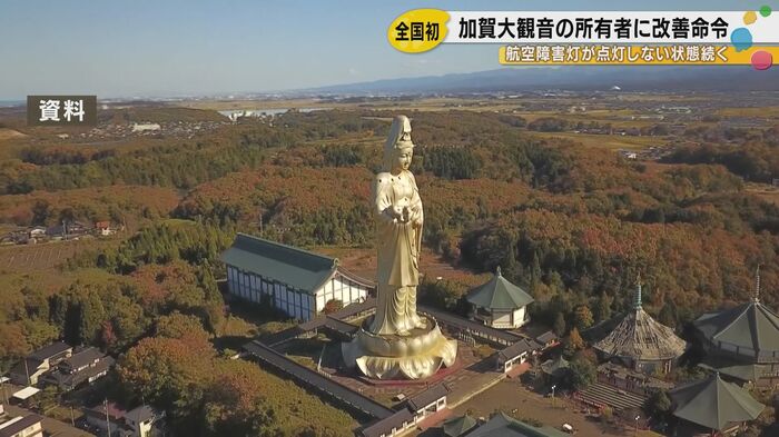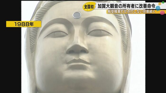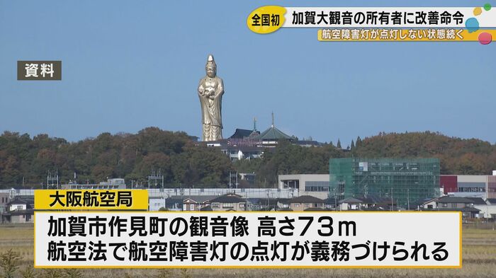 石川県加賀市に立つ高さ73メートルの巨大観音像が、少なくとも2006年から20年にわたって航空障害灯を点灯させていなかったことが明らかになった。大阪航空局は所有者である京都市の企業に対し、改善命令を出した。航空障害灯の管理に関する法律でこのような改善命令が出されるのは、全国で初めてのケースである。