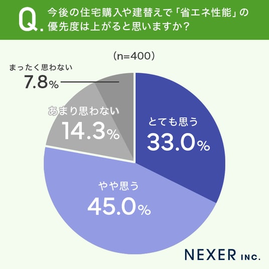 最後に、今後の住宅購入や建替えにおいて「省エネ性能」の優先度が上がるかどうかについて聞いてみました。